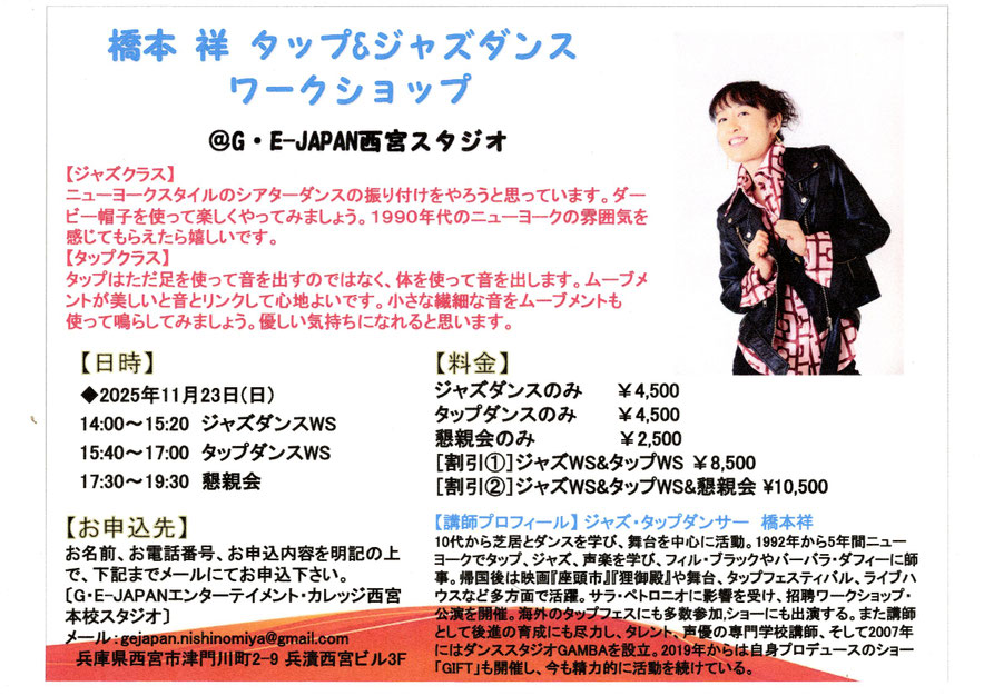 割引①ジャズWS&タップWS¥8,500 ②ジャズWS&タップWS&懇親会¥10,500